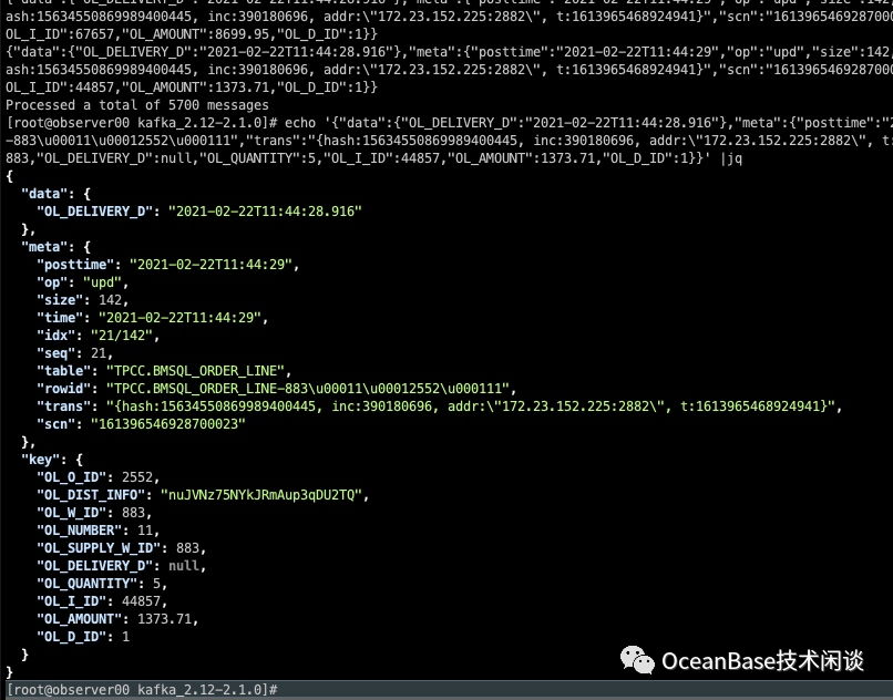 [root@observer00 kafka_2.12-2.1.0]# echo '{"data":{"OL_DELIVERY_D":"2021-02-22T11:44:28.916"},"meta":{"posttime":"2021-02-22T11:44:29","op":"upd","size":142,"time":"2021-02-22T11:44:29","idx":"21/142","seq":21,"table":"TPCC.BMSQL_ORDER_LINE","rowid":"TPCC.BMSQL_ORDER_LINE-883\u00011\u00012552\u000111","trans":"{hash:15634550869989400445, inc:390180696, addr:\"172.23.152.225:2882\", t:1613965468924941}","scn":"161396546928700023"},"key":{"OL_O_ID":2552,"OL_DIST_INFO":"nuJVNz75NYkJRmAup3qDU2TQ","OL_W_ID":883,"OL_NUMBER":11,"OL_SUPPLY_W_ID":883,"OL_DELIVERY_D":null,"OL_QUANTITY":5,"OL_I_ID":44857,"OL_AMOUNT":1373.71,"OL_D_ID":1}}' |jq