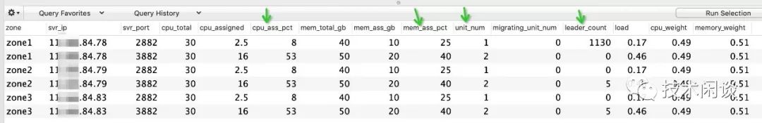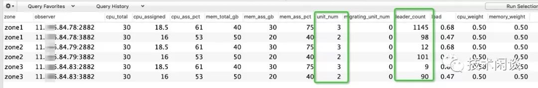 -- sys租户查看当前资源利用率selectzone,concat(svr_ip,':',svr_port) observer, cpu_total, cpu_assigned,cpu_assigned_percent cpu_ass_pct, round(mem_total/1024/1024/1024) mem_total_gb, round(mem_assigned/1024/1024/1024) mem_ass_gb, mem_assigned_percent mem_ass_pct, unit_num, migrating_unit_num,leader_count,round(`load`,2) `load`, round(cpu_weight,2) cpu_weight, round(memory_weight,2) memory_weight