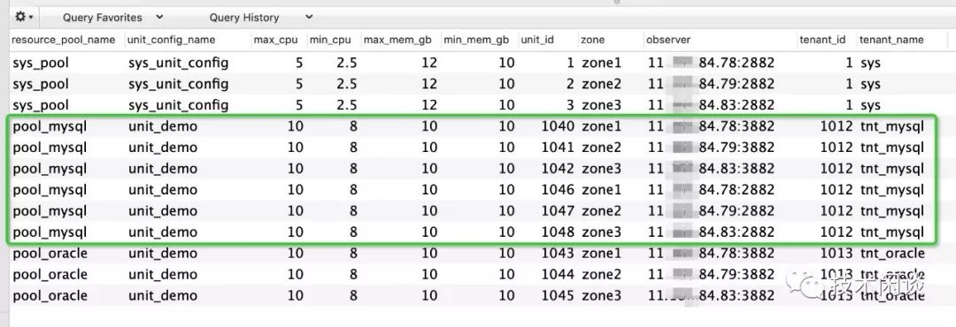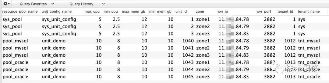 -- 创建资源池(分配资源)create resource poolpool_mysql unit = 'unit_demo', unit_num = 1;create resource poolpool_oracle unit = 'unit_demo', unit_num = 1;