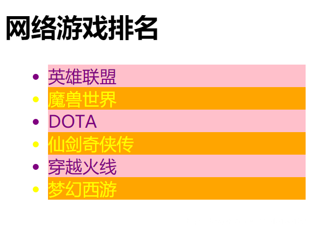<!DOCTYPE html><html><head><meta charset="UTF-8"><title>dom属性</title><style type="text/css">.purple{color: purple;background-color: pink;}.yellow{color: yellow;background-color: orange;}</style></head><body><h2>网络游戏排名</h2><ul><li>英雄联盟</li><li>魔兽世界</li><li>DOTA</li><li>仙剑奇侠传</li><li>穿越火线</li><li>梦幻西游</li></ul><script type="text/javascript">ul=document.getElementsByTagName("ul");lis=ul[0].getElementsByTagName("li");for(var i=0;i<lis.length;i+=2){lis[i].setAttribute("class","purple");}for(var i=1;i<lis.length;i+=2){lis[i].setAttribute("class","yellow");}</script></body></html>