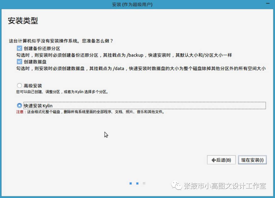 选择上图【快速安装Kylin】选项,同时可勾选【创建备份还原分区】和【创建数据盘】;