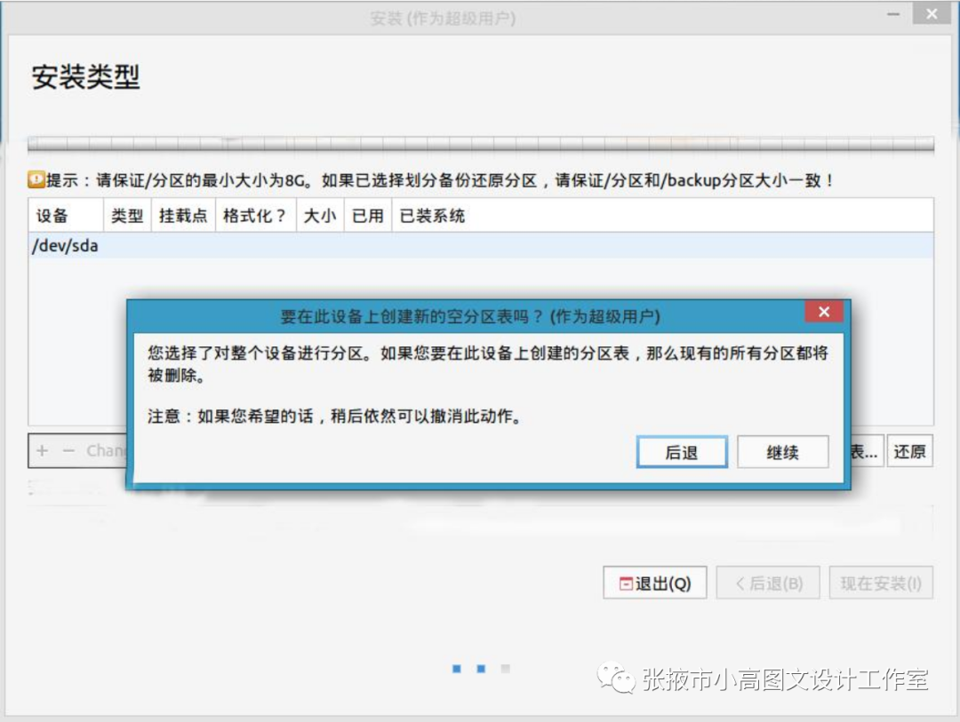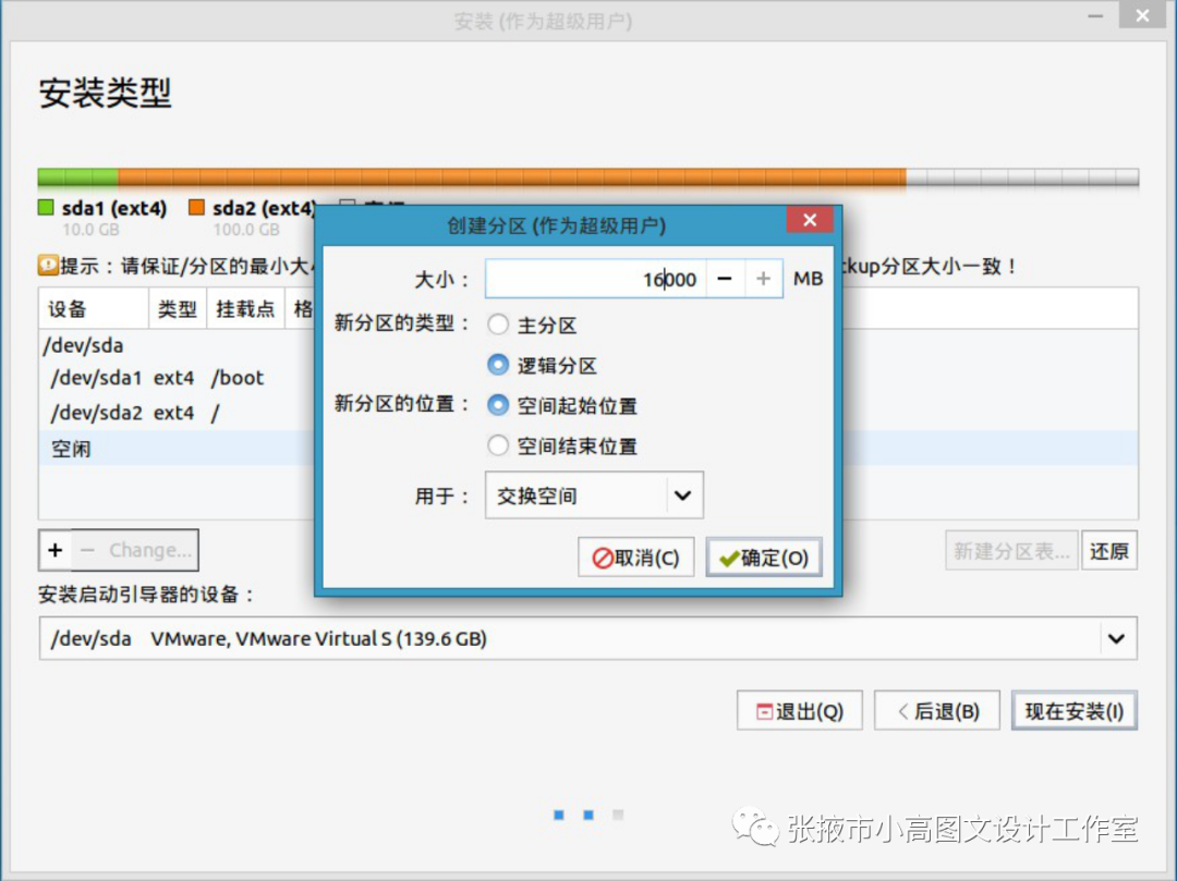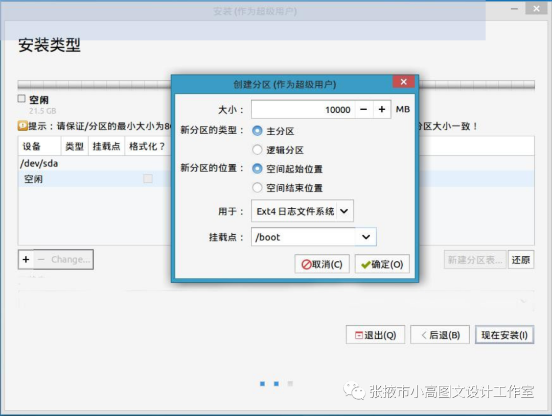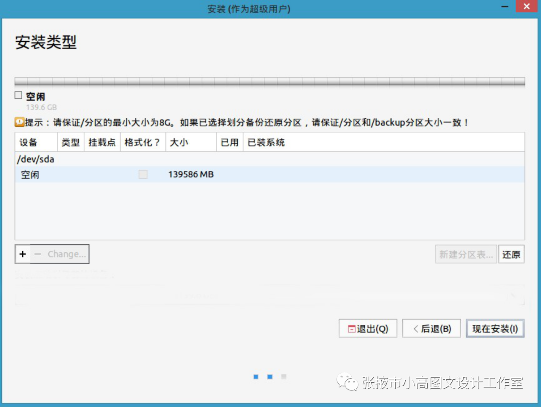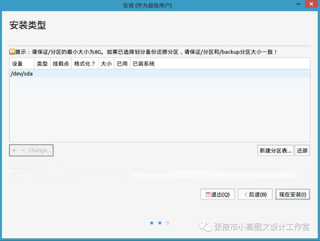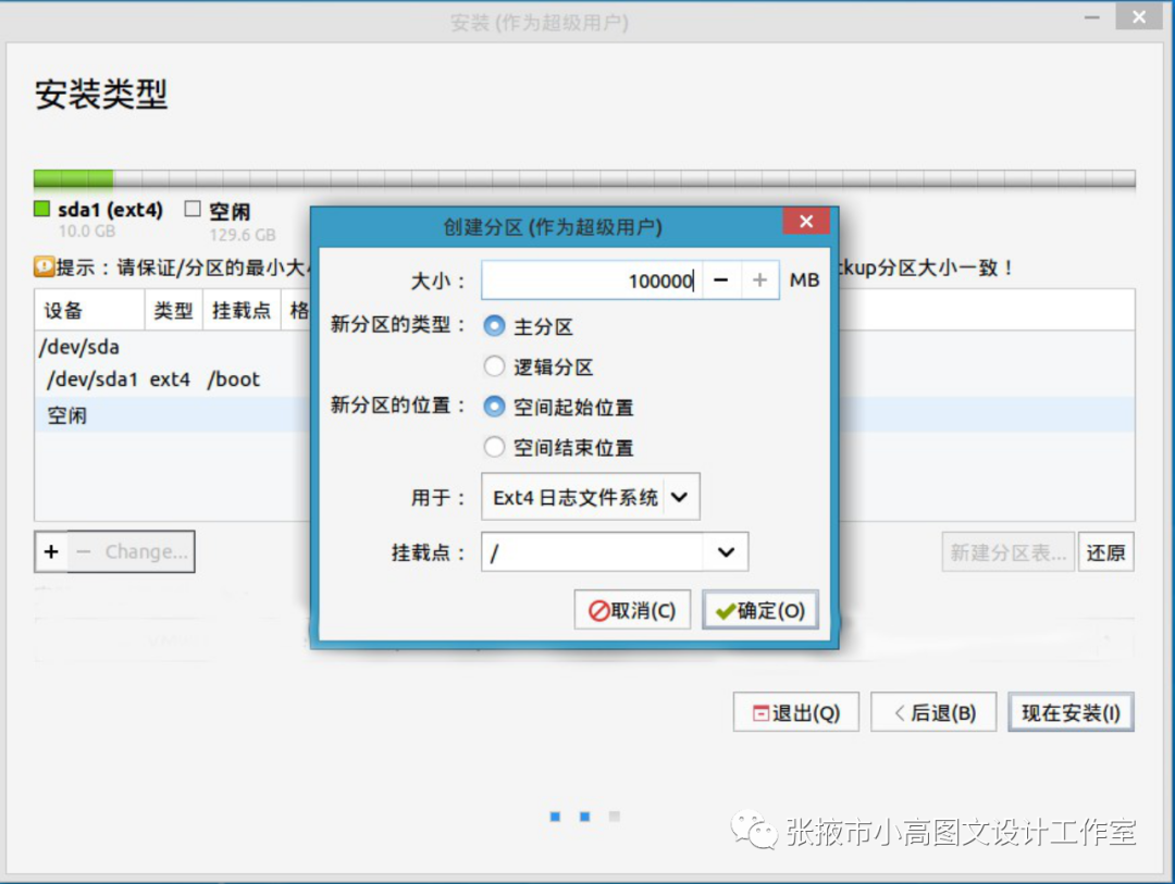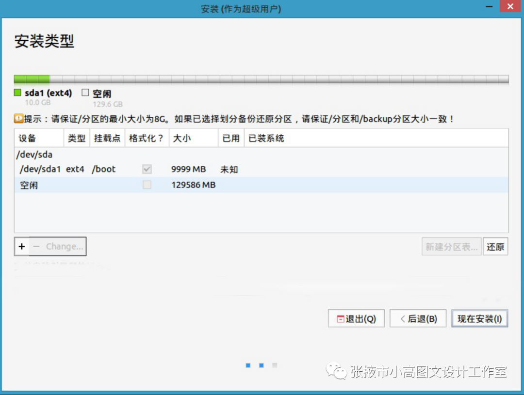 分区完成后,点击【现在安装】按钮。后续步骤请参考“全盘安装”。