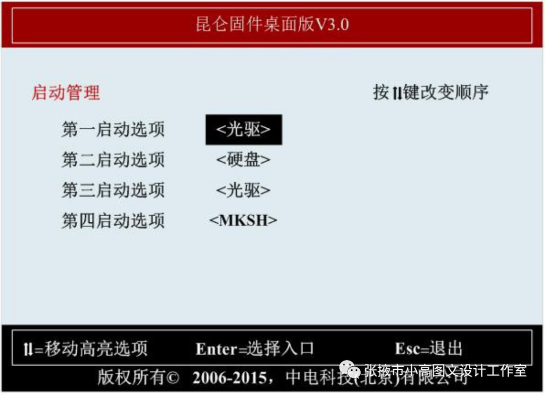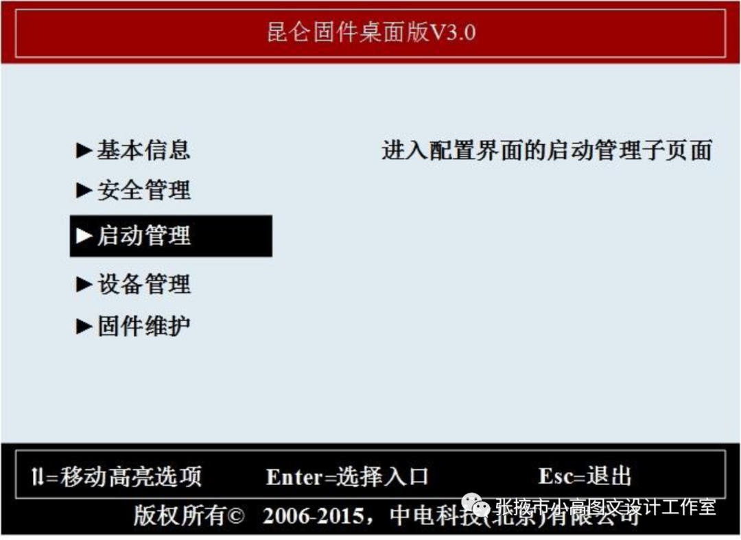通过上下方向键选择第三项【启动管理】,回车后进入启动引导界面,如图所示:
