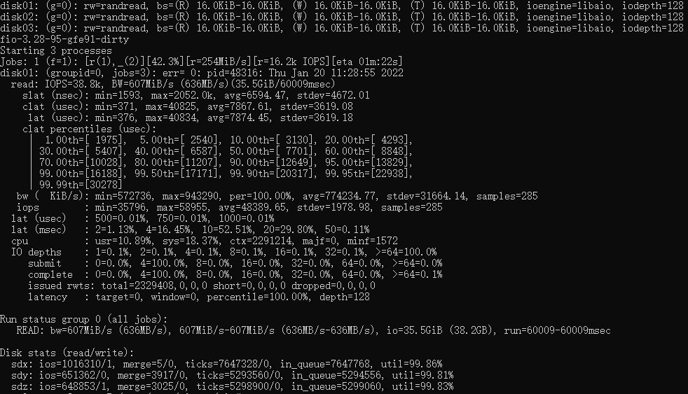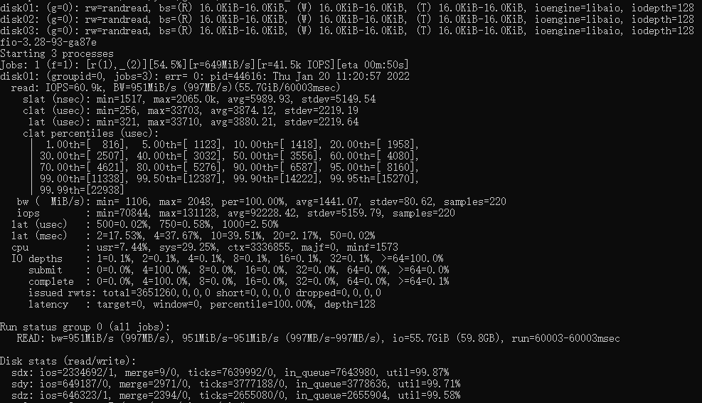 其次是经过多线程优化的fio测试成绩,IOPS达到60.9K。