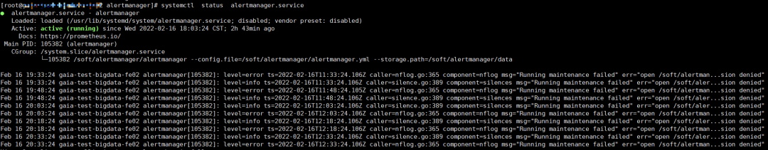 [Unit]Description=alertmanagerDocumentation=https://prometheus.io/After=network.target[Service]User=prometheusGroup=prometheusExecStart=/soft/alertmanager/alertmanager --config.file=/soft/alertmanager/alertmanager.yml --storage.path=/soft/alertmanager/dataRestart=on-failure[Install]WantedBy=multi-user.target