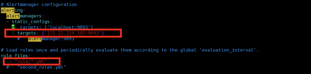 alerting:alertmanagers:- static_configs:- targets: ['localhost:9093'] #根据实际alertmanager服务地址配置。rule_files:- "rule/*.yml" #自定义规则存储目录,可以通过*.yml来通配该目录下所有规则。