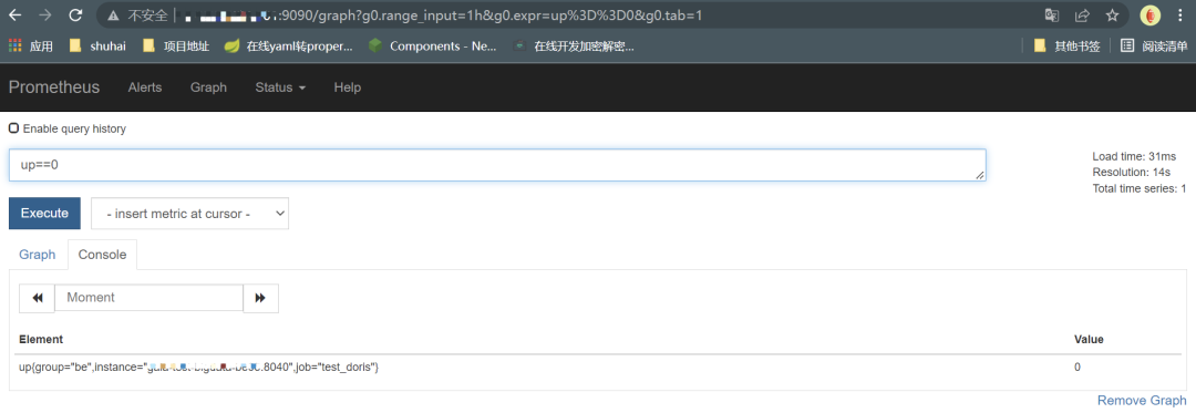 groups:- name: doris_instance_downrules:- alert: Doris Backends Downexpr: up {group="be", job="pro-doris"} == 0for: 20slabels:user: dorisseverity: errorannotations:summary: "doris Instance {{ $labels.instance }} down"description: "doris {{ $labels.instance }} of job {{ $labels.job }} has been down for more than 20s."- alert: Doris Frontends Downexpr: up {group="fe", job="pro-doris"} == 0for: 20slabels:user: dorisseverity: errorannotations:summary: "doris Instance {{ $labels.instance }} down"description: "doris {{ $labels.instance }} of job {{ $labels.job }} has been down for more than 20s."