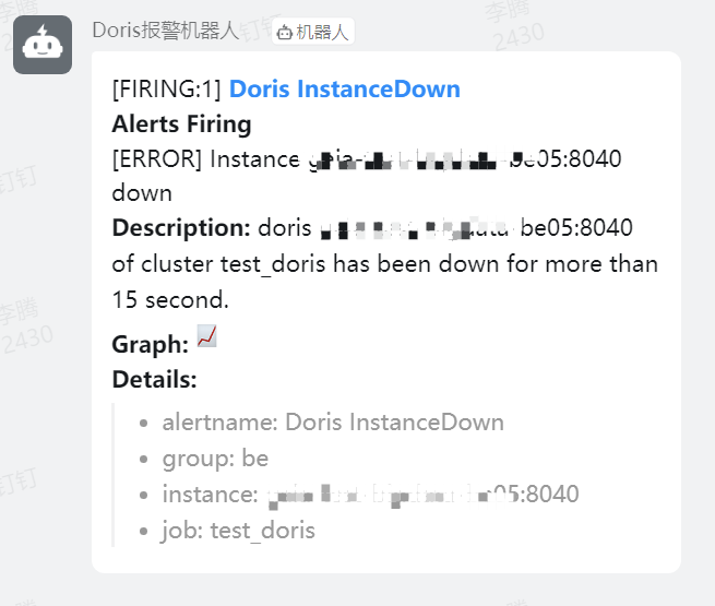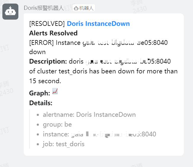 当 Doris 集群中的 instance 出现 down 机后,钉钉群里新建的机器人会发出报警信息。