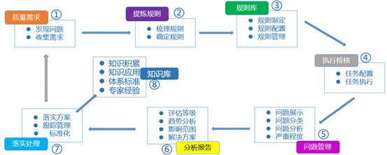 通过数据质量评估标准,对目标数据进行质量问题发现,然后进行全链分析(血缘分析、影响分析),找到问题出现的环节及具体的原因。如果引入了专业的数据治理系统(工具),则可以按如下图所示流程推进,主要流程包括质量问题定义、检核监控、发现分析、跟踪反馈及知识库沉淀等(循环、持续)。