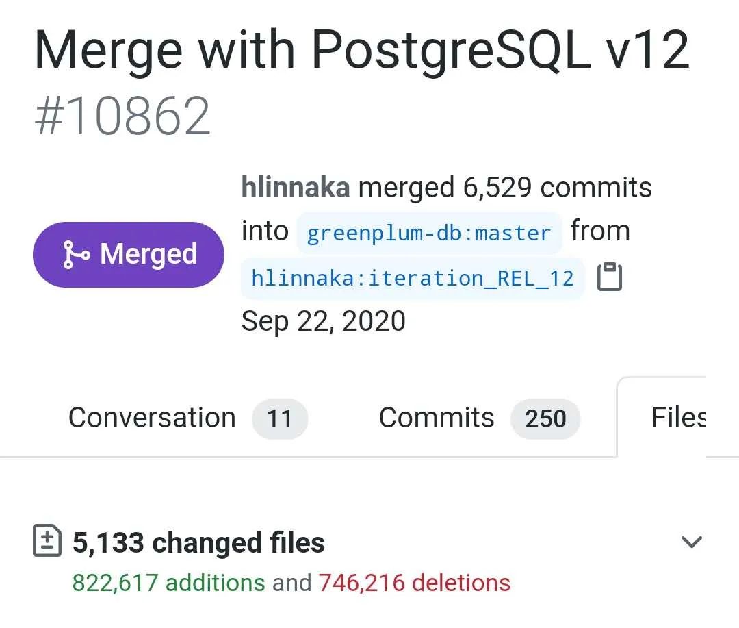 PostgreSQL 9.6至12间包含6527个提交,涉及代码修改约200万行,Greenplum内核团队在此次升级中通过四千五百多次修改解决了5263个代码冲突、几百个测试报错和代码重构,工作量之大难以想象。之所以此次内核升级挑战如此大的难度,直接跨越三个版本,主要是因为上游的分区表实现在版本12时才基本完善,我们希望Greenplum 7能为社区带来更多激动人心的新功能和性能提升。