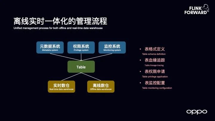 对于数仓的管理流程而言,无非就是元数据是如何管理的,表的字段是如何定义的,表的血缘如何追踪以及表的权限如何管理,以及表的监控如何实现。如今在 OPPO 内部,离线和实时数仓的这些管理流程能够做到一致,首先两者使用的流程是一致的,其次表的 Schema 的定义以及表的血缘能够保证一致,而不需要用户重新申请和定义。