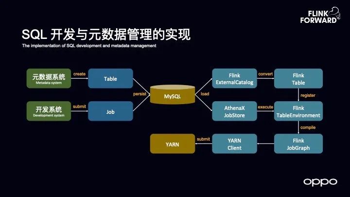 对于作业而言,OPPO 则使用了谷歌开源的框架,通过对于 Job Store 的实现可以从数据源头比如 MySQL 来加载这个作业,将这个作业提交给 Flink 的 Table 环境来做作业的编译,最终定义成为 Job Graph,然后提交给 YARN,这样的流程就是支撑 OPPO 实时数仓的框架。