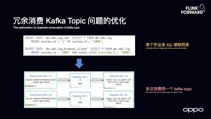 在 OPPO 的场景下,我们发现了自己所存在的一个很棘手的问题,那就是很多用户在写 SQL 的时候会出现同一个作业需要写多个 SQL,比如刚才提到的接入场景,如果想要做通道的拆分,通常而言需要来自同一个表格,经过不同的过滤,然后导入到不同的数据表里面去,而 OPPO 希望在单个作业中就能够实现这样的表达。但是这样做所带来的问题就是将多个 SQL 放在一个作业里面执行就会生成多个 Data Source,多个 Data Source 就会重复地消费 Kafka,这就使得 Kafka 集群的压力非常大,原因是很多 Kafka 机器的写入和读取的操作比例差距非常大,一个 SQL 的作业可能会读取很多次 Kafka 的 Topic。而这是没有必要的,因为对于同一次作业而言,只需要消费一次 Kafka 即可,接下来数据可以在 Flink 内部进行消化和传播。OPPO 针对于上述问题实现了一个非常巧妙的优化,因为 Flink 的 SQL 会生成一个 Job Graph,在这之前会生成一个 Stream Graph。而 OPPO 通过改写 Stream Graph,使得无论用户提交多少个 SQL,对应只有一个 Data Source,这样就降低了对于 Kafka 的消费量,而且带为用户来了很大的收益。