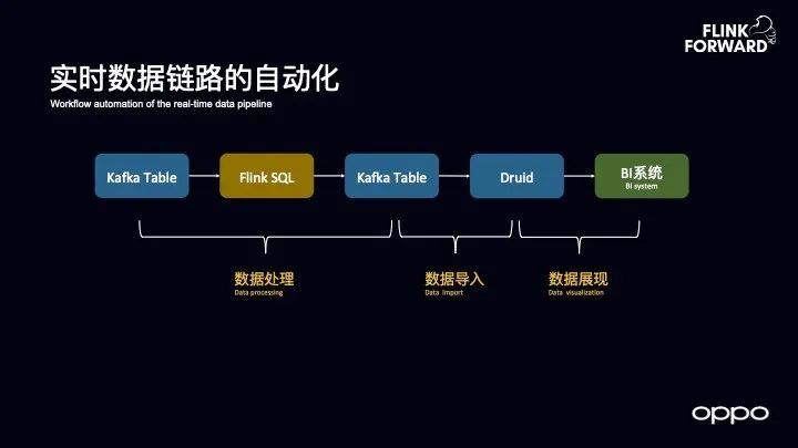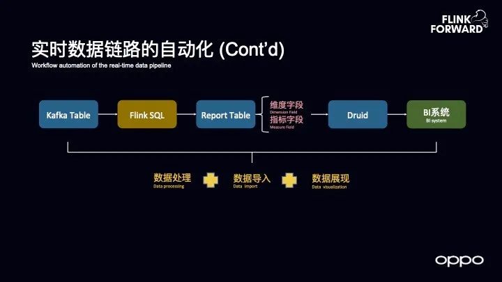 上述链路中的数据处理、数据导入和数据展现三个环节是比较割裂的,因此需要三种不同角色的人员来介入做这件事情,因此 OPPO 希望能够打通实时数据链路。OPPO 做了如下图所示的实时数据链路的自动化,对于 Kafka 的表做了抽象,而对于用户而言,其就是用于做 BI 展示的表,Kafka 的表需要定义哪些是维度、哪些是指标,这是做报表展示最基本的字段定义。当完成了上述任务之后,就可以将整个实时数据链路以自动化的方式串起来。当用户将 SQL 写完之后,可以自动化地探测 Report Table 需要导入到 Druid 里面去,以及哪些是指标,哪些是维度,并且可以将数据从 Druid 自动地导入到 BI 系统。这样一来,对于用户而言只需要写一个 SQL,之后就可以在 BI 系统之上看到报表了。