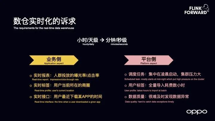 但是随着业务的发展以及数据规模的不断膨胀,OPPO 对于数仓实时化的诉求越来越强烈。OPPO 对于数仓实时化的诉求可以分为两个维度,即业务维度和平台维度。对于业务维度而言,越来越需要去做精细化的运营,也越来越需要去挖掘数据的价值,所以无论是实时报表、实时标签还是实时接口等都需要实时化能力。