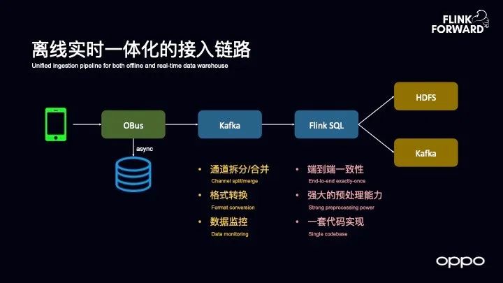 从以上三个抽象维度来看,我们希望从离线到实时能够将抽象保持一致的,这样对于用户而言成本是最低的。接下来则会为大家介绍如何将迁移的成本保持最低。首先为大家介绍离线实时一体化接入链路,OPPO 的数据从手机端到 OBus 内部数据收集服务,收集之后会统一落入到Kafka中去,再通过 Flink SQL 的任务可以同时落入 HDFS 和 Kafka 中去。Flink 可以实现数据通道的拆分,对于 OPPO 这样一个手机公司而言,很多 APP 上报都是通过同一条通道,因此在将数据落入到数仓之前需要对于数据通道进行拆分,根据不同的业务和属性做一些拆分,除此之外还会做一些格式的转换。另外一部分功能就是实现数据的监控,因为将数据落入到 HDFS 时需要有一个很重要的问题就是分区感知问题,比如离线 ETL 任务如何知道分区已经结束了。OPPO 的做法是根据端到端不同数据的对账实现的,因此需要在 Flink SQL 这一层完整地记录收到多少条数据,写入了多少条数据,然后和前面的 OBus 做一个数据对账的对比,如果对比结果在一定范围之内,就可以写一个成功文件,这样就可以让后端的 ETL 任务开始运行。