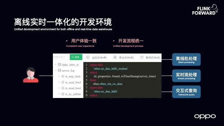 当有了对于底层逻辑的观察之后,就能够推导出顶层设计情况。OPPO 希望所设计出来的实时数仓能够实现从离线到实时的平滑迁移,之前大家如何使用和开发离线数仓,如今到了实时数仓也希望大家如何开发和使用。通常而言,当设计一款产品或者平台的时候,可以划分为两层,即底层实现和上层抽象。对于底层实现而言,可能会有不同的技术,从 Hive 到 Flink,从 HDFS 到 Kafka。而在上层抽象而言,则希望对于用户而言是透明的。