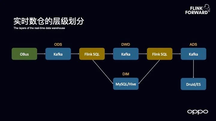 如下图所示的是 OPPO 实时数仓的分层结构,从接入层过来之后,所有的数据都是会用 Kafka 来支撑的,数据接入进来放到 Kafka 里面实现 ODS 层,然后使用 Flink SQL 实现数据的清洗,然后就变到了 DWD 层,中间使用 Flink SQL 实现一些聚合操作,就到了 ADS 层,最后根据不同的业务使用场景再导入到ES等系统中去。当然,其中的一些维度层位于 MySQL 或者 Hive 中。