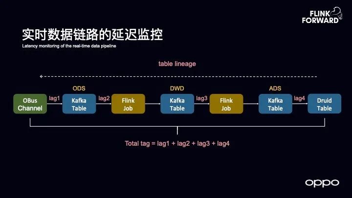之前,OPPO 做数据链路的延迟监控时也属于单个点进行监控的,可以从下图中看出至少有三级的 Kafka 的 Topic,对于每个 Topic 都存在延迟的监控。而对于用户而言,关注的并不是点,而是面,也就是最终展现的数据报表中延迟情况如何。因此, OPPO 也实现了全链路的延迟监控,从接入的通道开始到每一层的 Kafka 消费,都将其 lag 情况汇总起来,探索到每一级的 Flink SQL 表的血缘关系。有了这样的血缘关系之后就可以从 Druid 表推导到前面所接入的链路是哪一个,然后将总体延迟加起来,这样就可以反映出整体链路的延迟情况。