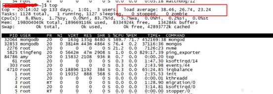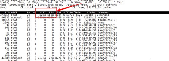 此外,查看该机器的内存,可以看到内存总大小为190G,其中已经使用110G左右,几乎是mongod的存储引起占用,这样会造成内核态的page cache减少,大量写入的时候内核cache不足就会引起磁盘缺页中断。