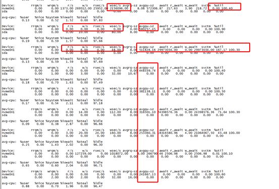 如第3节所述,当wiredtiger大量淘汰数据后,发现只要每秒磁盘写入量超过500M/s,接下来的几秒钟内util就会持续100%,w/s几乎跌0,于是开始怀疑磁盘硬件存在缺陷。