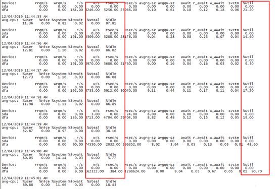 此外,在大量写入IO后很长一段时间util又持续为0%,现象如下: