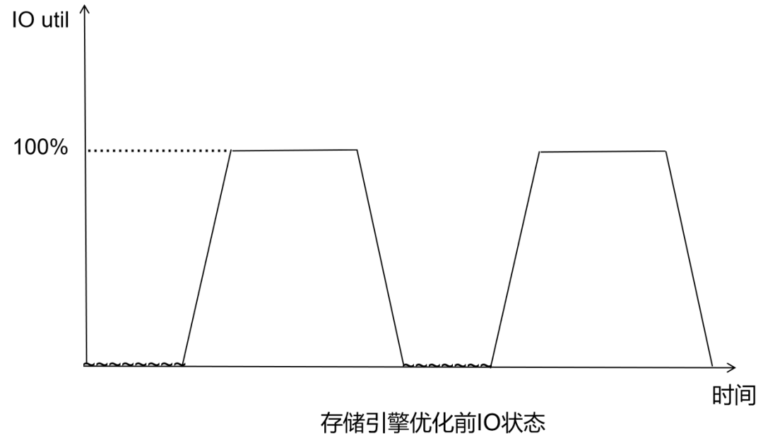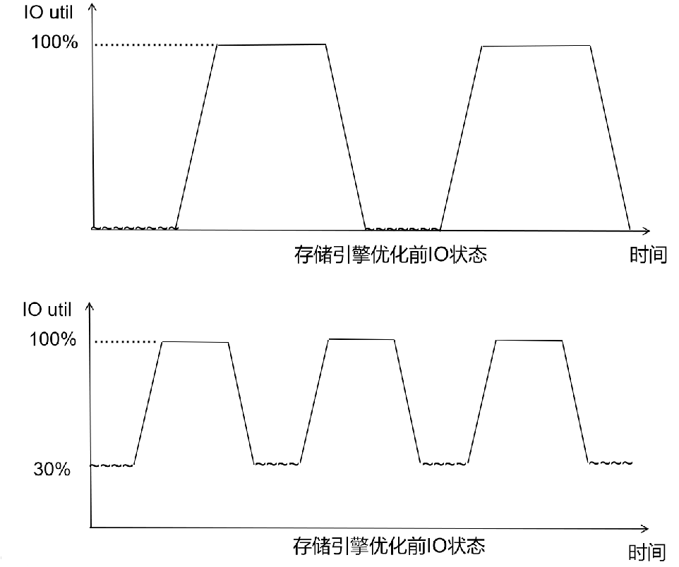 从上面的IO负载图可以看出,之前的IO一会儿为0%,一会儿100%现象有所缓解,总结如下图所示:
