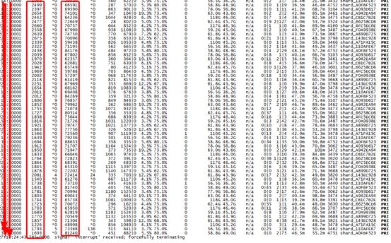 从图中可以看出IO很长一段时间持续为0%,然后又飙涨到100%持续很长时间,当IO util达到100%后,分析日志发现又大量满日志,同时mongostat监控流量发现如下现象: