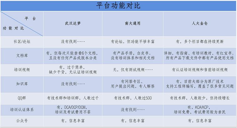 值得一提的是,社区上还有总裁杜胜杜总关于“国产数据库发展总结及未来趋势”的演讲视频、培训部周传胜老师关于“db市场外部竞争环境解析”的售前培训视频。熟悉国内数据库发展历程的同学,可能会像我一样对这两个视频产生共鸣。要知道,南大通用崔总在企业发展的高峰时期遗憾离世;武汉达梦冯总以七十多岁的高龄,奔波在一线;而成立最早的人大金仓在这段时间完成了新老交替。杜总裁的演讲,显示出人大金仓高层对国产数据库发展和自身产品的定位和规划,有着清晰的认识。“数据库应当在细分领域寻找机会”,可不是嘛,以Oracle数据库之强大,不也一样沉戟于云数据库之战吗?杜总裁的演讲完全打破了我关于传统校企陈旧和傲慢的感观,使得这家企业的形象在我的脑海中一下鲜明起来。强烈建议新来的同学都去学习下这两个视频,相信你会和我一样,对国产数据库的崛起,对金仓数据库的发展,充满信心。