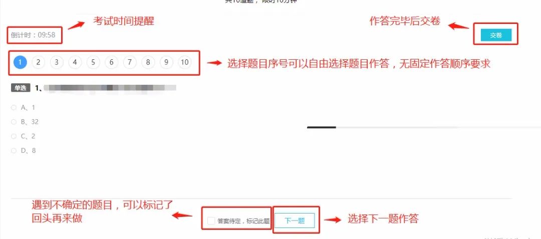可以自由选择题目序号作答,不确定的题目可以标记了稍后作答,中途退出考试页面重新进入即可继续考试,已作答题目不会丢失。作答完毕后点击交卷完成考试。
