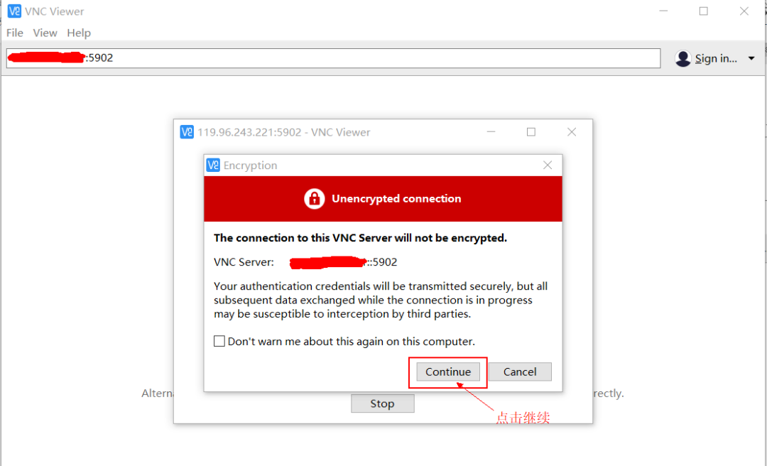3、考生通过vnc viewer去连接考试服务器,在地址栏输入考试云主机的ip:5902
