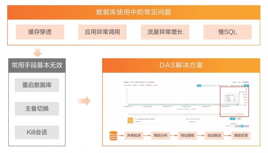 企迈云商借助阿里云DAS数据库自治服务通过7 x 24小时的异常检测,自动检测到实例出现异常,并触发根因分析,定位异常的请求,从而确定导致问题的异常SQL,从根本上解决数据库性能问题。DAS在找到异常根因SQL后3分钟内自动限流,帮助业务恢复正常,全程自动操作,无需人工介入,快速准确恢复数据库服务,将对业务的影响降至最低,保障用户体验减少消费者流失风险,为数据库构建了强大的自动免疫系统。