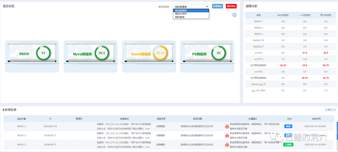 这是某用户的IT健康管理微应用入口。监控看板是调控人员使用的应用,调控人员负责信息系统日常监控与处置调度工作。他们对某个具体专业方面的专业技能不是很深入,他们需要及时掌握当前系统的健康状态,并把发现的问题推送给某专业的技术人员。