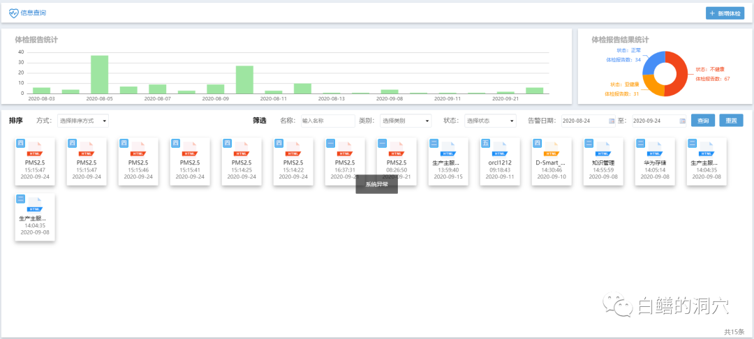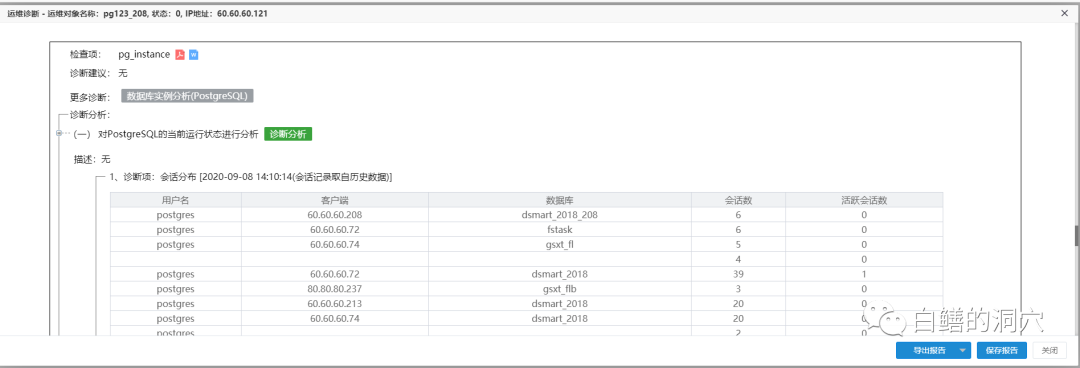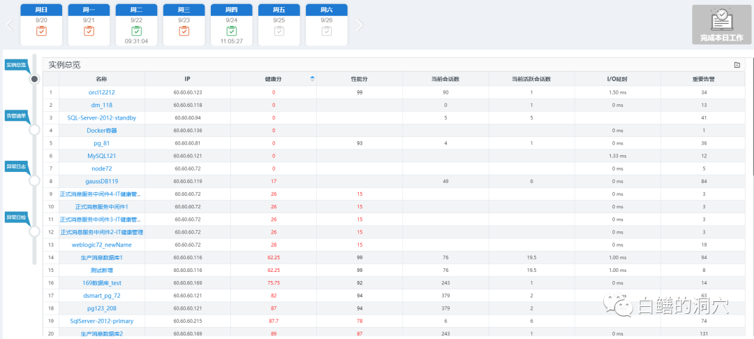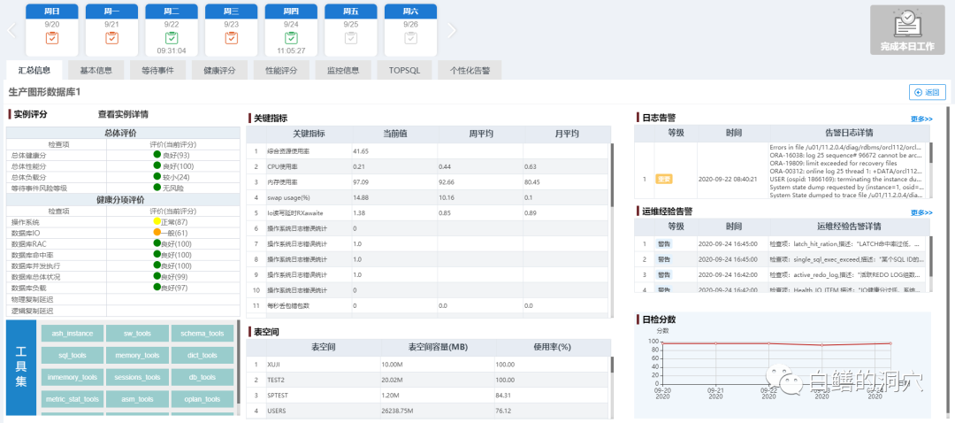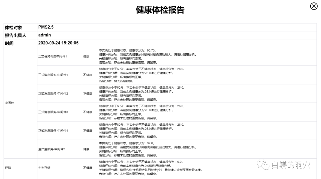 一键体检是检修专业的人员的工作平台,与传统的巡检不同,对于某个系统,通过“一键巡检”可以立即生成巡检报告,其数据使用已经采集或者归集的数据,不需要额外采集。巡检工作在后台完成,不需要在生产系统上补充采集。