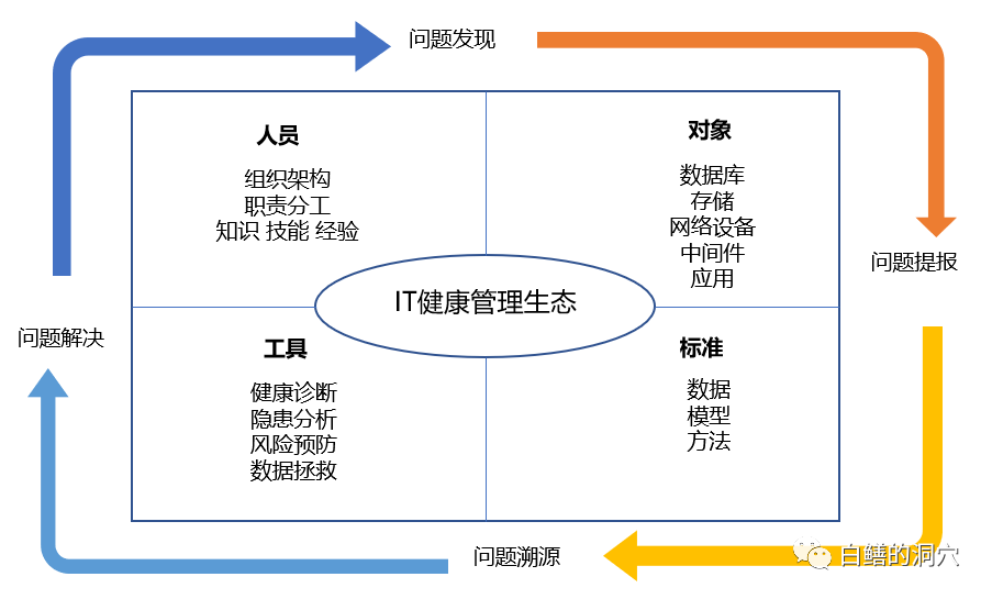 对于专业人员,通过深度分析工具可以随时开展深入诊断的工作。针对不同的用户,可以根据其运维管理的特点与运维人员的技能水平来快速定制IT健康管理的微应用,让运维工具场景化。运维工具场景化有助于工具快速落地,并且能够持续应用。传统的运维工具一般来说是根据工具的内容进行组织的,在工具研发过程中虽然也考虑了一些场景,但是与实际应用环境的场景差异较大。另外由于工具中的数据架构往往只是为了完成工具的功能,因此数据架构也较难根据场景需要去做相应的调整。而IT健康管理是自顶向下设计,自底向上建设的。首先通过方法论确定IT健康管理的目标: