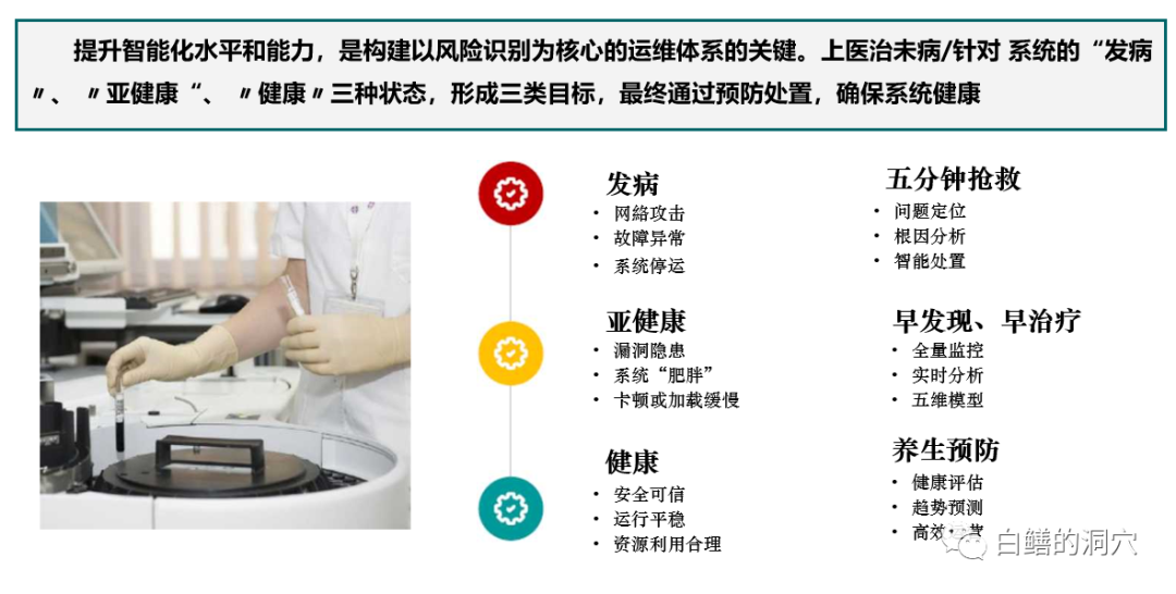 其建设愿景是通过对企业运维自动化数据的综合归集、综合分析,让数据发挥更大的作用。就像医院诊疗一样,在系统健康时养生预防,在亚健康状态时早发现早治疗,在发病时能五分钟快速抢救。