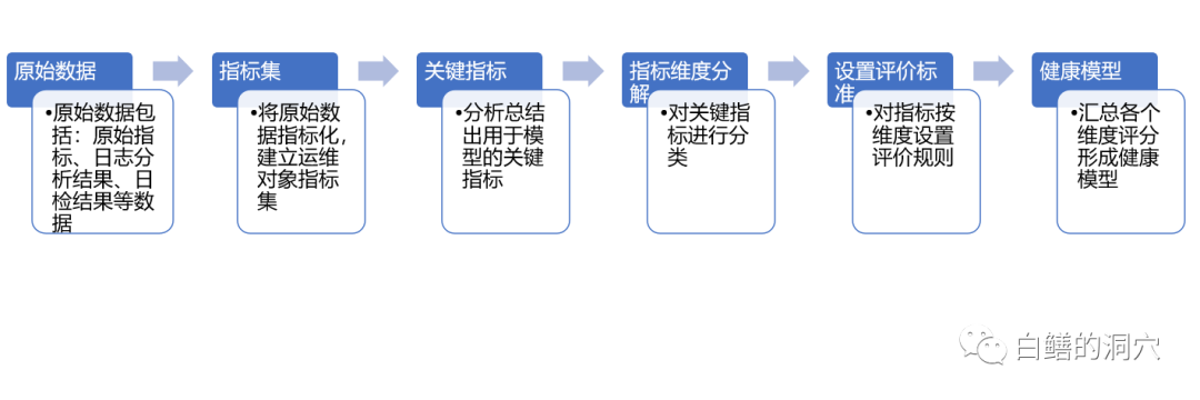 经过梳理后构建运维对象的标准化指标体系,提炼分析关键指标,构建运维维度体系,建立标准化评估体系,建立运行状态健康度模型,包括健康模型、容量模型、故障模型,使用运维对象的指标数据来构建状态模型生成运行状态评价指标。模型分专家模型和智能模型,专家模型用于评价打分,智能模型则提供智能评分及趋势预测。