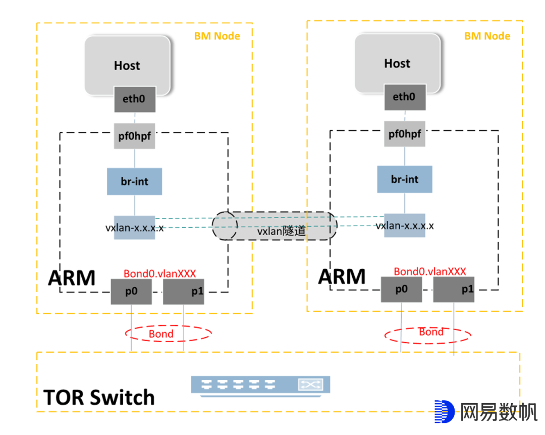 系统装机时与用户的正常业务流量都使用智能网卡模式,并且都使用vxlan overlay隧道;
