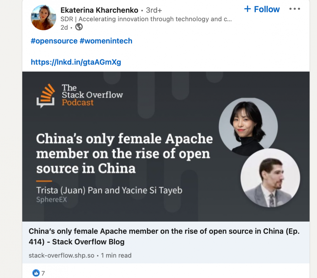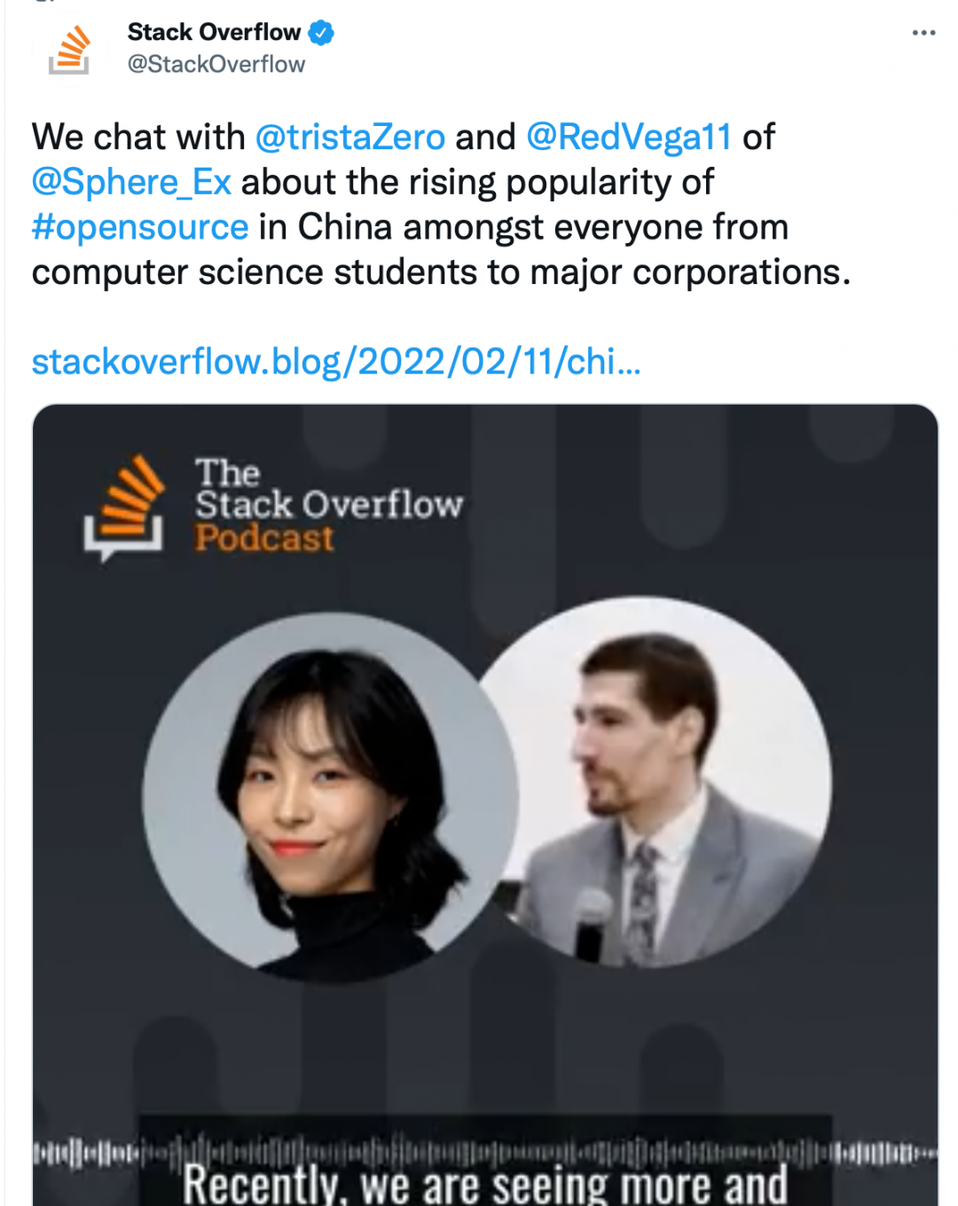 *收听链接:https://stackoverflow.blog/2022/02/11/chinas-only-female-apache-member-on-the-rise-of-open-source-in-china-ep-414/