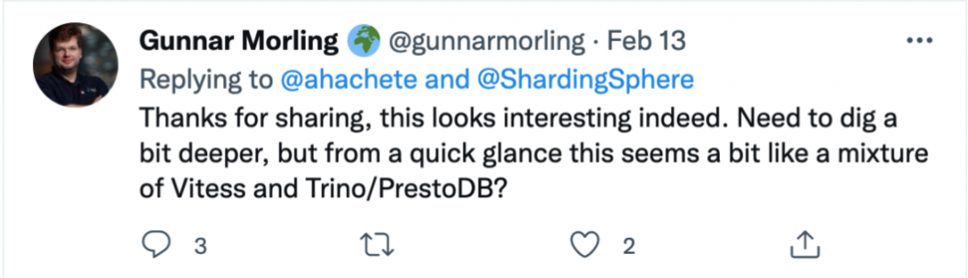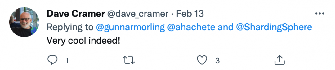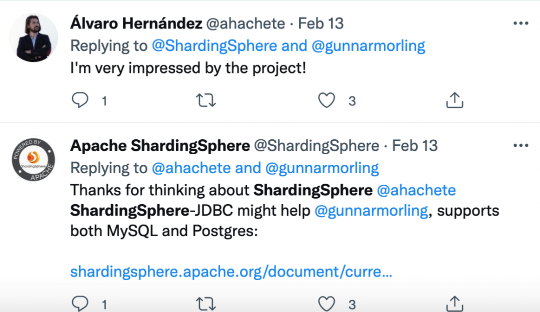 近日,PostgreSQL 主要 Contributor Dave Cramer,曾经开发出 JfrUnit、kcctl 和 MapStruct 的 Red Hat 开源软件工程师兼 Debezium 及 Bean Validation 2.0 项目负责人 Gunner Morling,以及提供 PostgreSQL专业服务与产品的 OnGres Inc 公司创始人 Álvaro Hernández 在 Twitter 上纷纷表示对 Apache ShardingSphere 技术的认可。