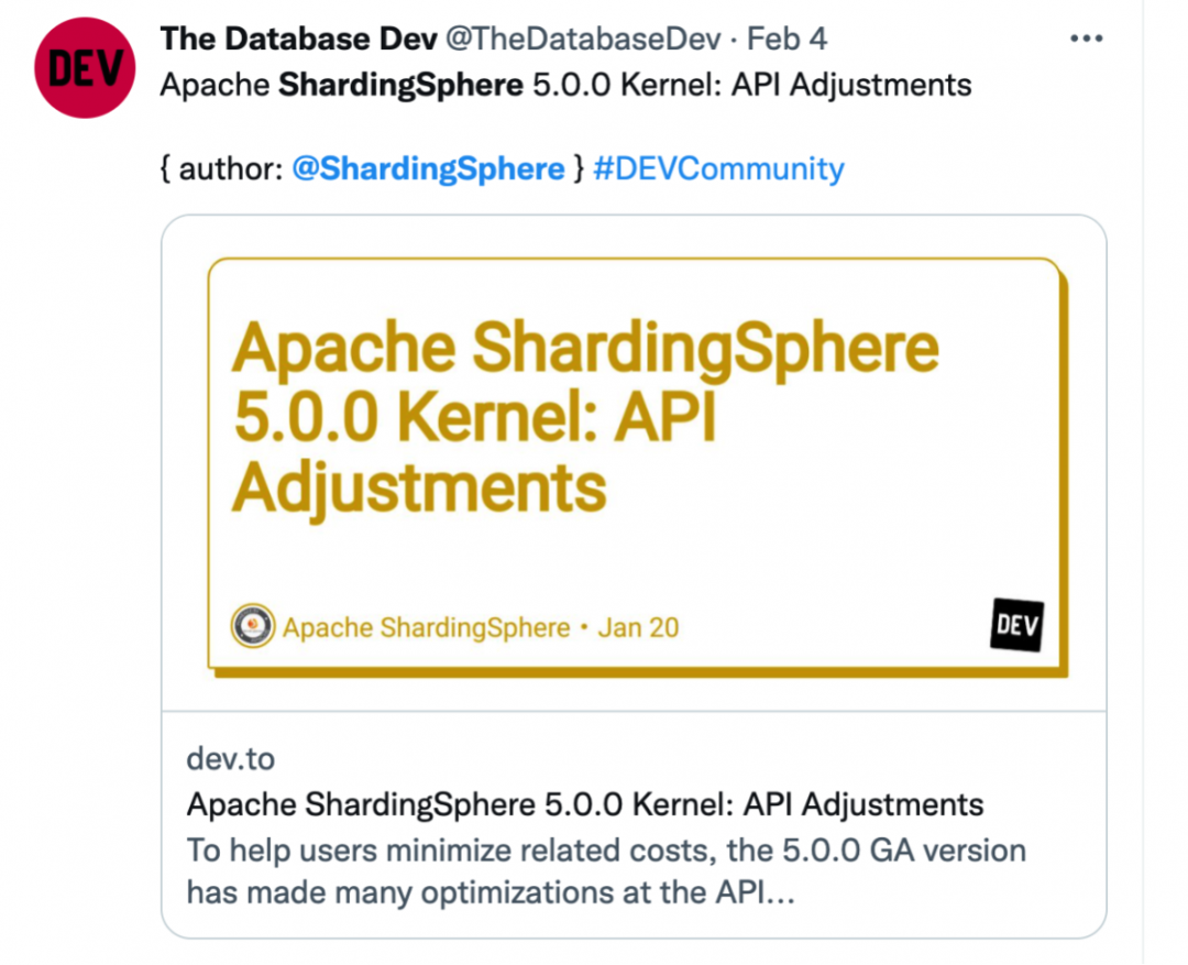 Dev.to 平台官方精选数据库技术相关编辑团队 The Database Dev 在其 Twitter 积极转发 Apache ShardingSphere 5.0.0 内核技术文章。Dev Community(Dev.to)由 Forem 的联合创始人 Ben Halpern、Jess Lee 和 Peter Frank 领导,旨在建立开发者透明共建的协作、学习的开源生态系统。