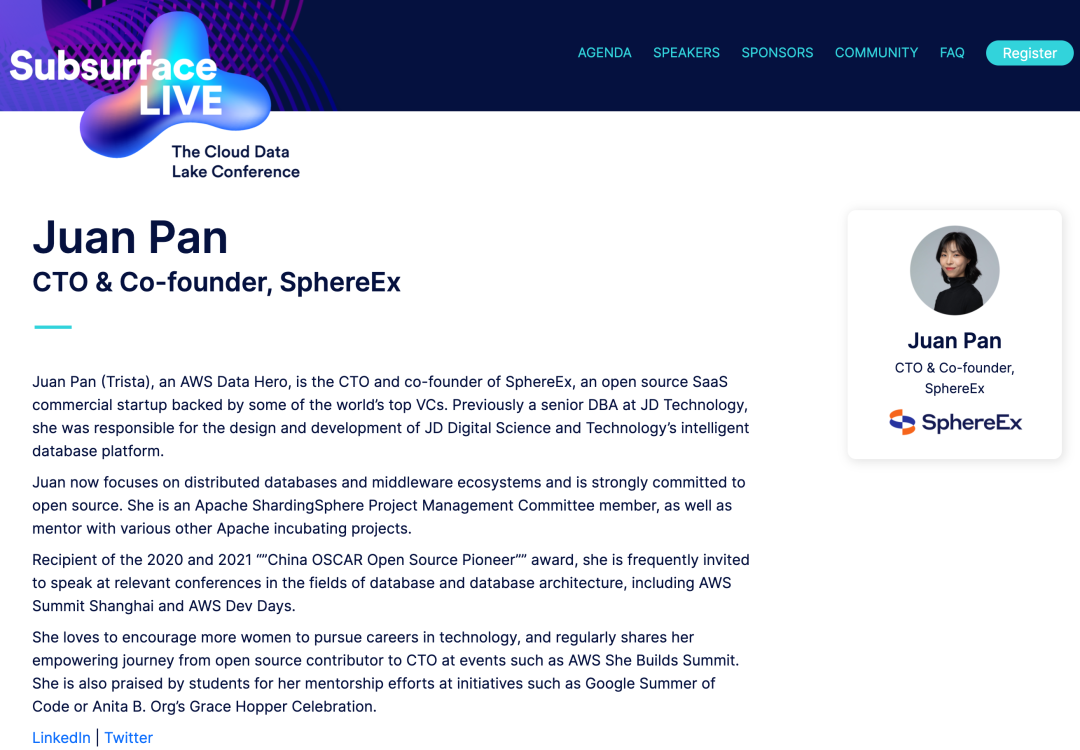Apache ShardingSphere PMC、SphereEx CTO 潘娟将受邀参加 Subsurface 大会 Keynote 与 Panel 演讲,为大家带来 “From DBA & Open Source Contributor to CTO & Co-Founder”、“Women in Data Panel” 两个主题分享,欢迎大家关注。