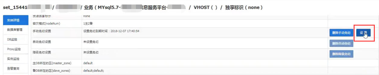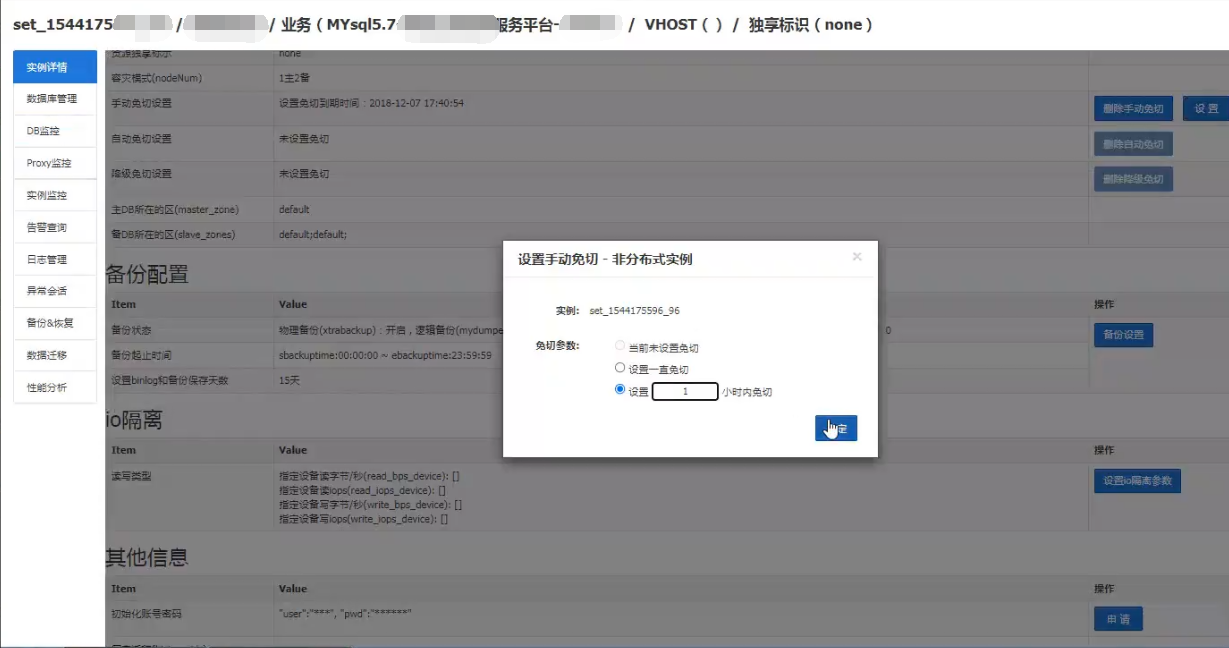 进入赤兔前台,点击实例,并进入实例详情,设置“手动免切设置”,将这个实例设置1小时之内免切。