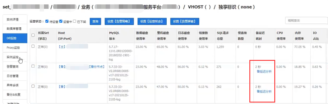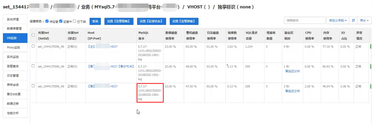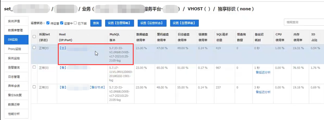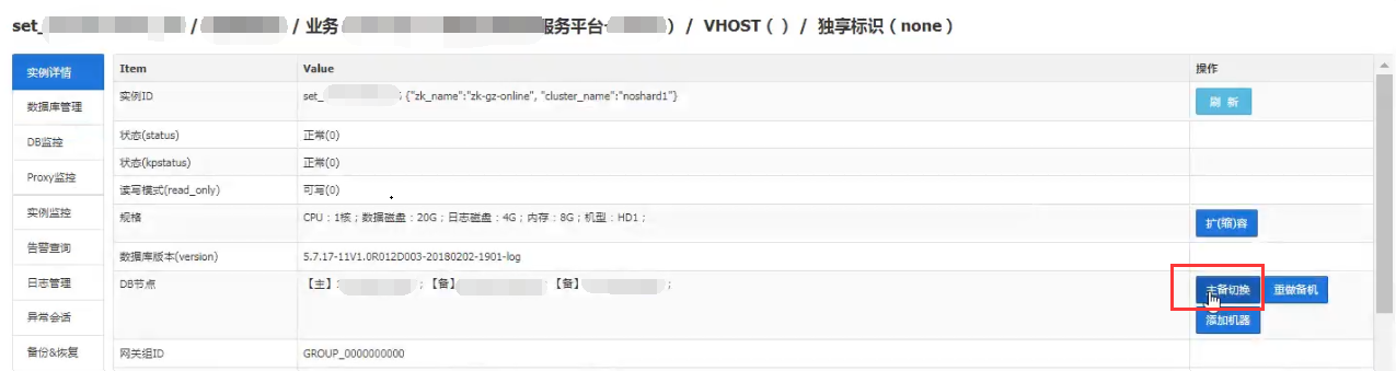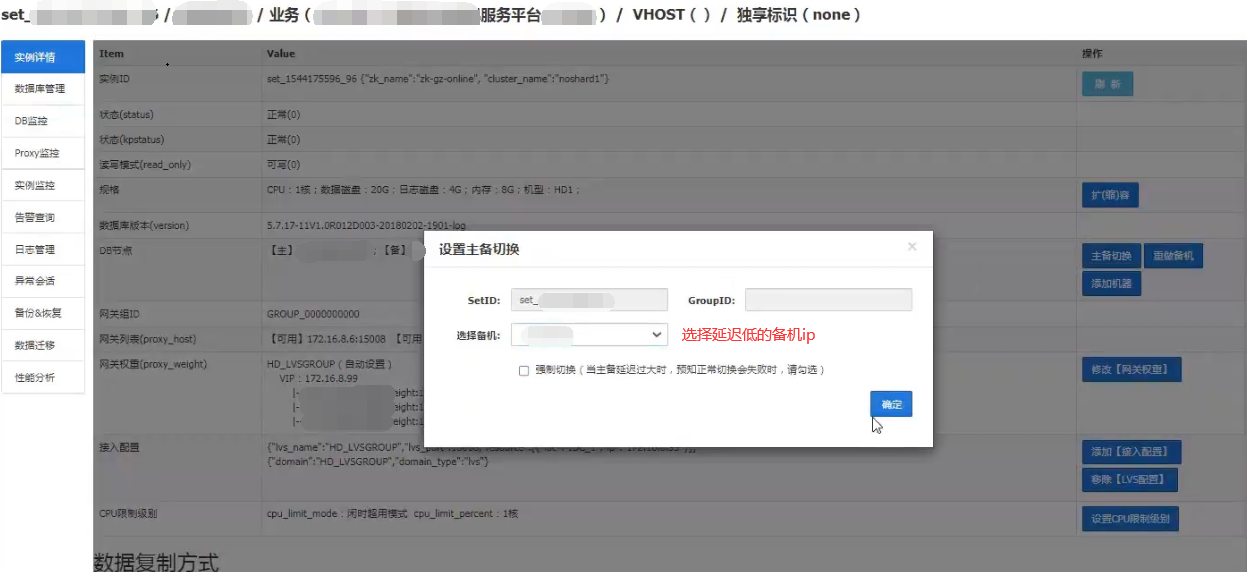 如上图所示,备DB都成功升级后,然后赤兔前台查看确认主备延迟不高后,做主备切换,如下图。