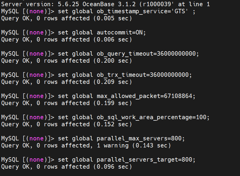 Server version: 5.6.25 OceanBase 3.1.2 (r10000392021123010-d4ace121deae5b81d8f0b40afbc4c02705b7fc1d) (Built Dec 30 2021 02:47:29)