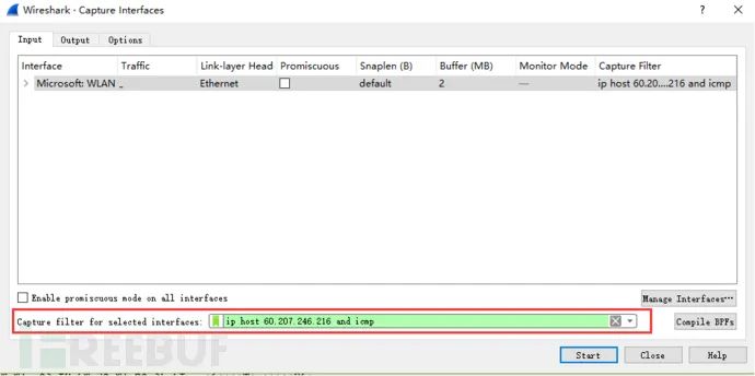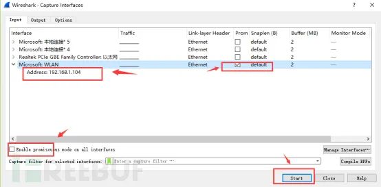 选择菜单栏上Capture -> Option,勾选WLAN网卡(这里需要根据各自电脑网卡使用情况选择,简单的办法可以看使用的IP对应的网卡)。点击Start。启动抓包。