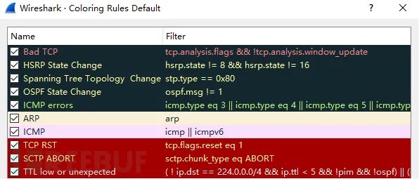 说明:数据包列表区中不同的协议使用了不同的颜色区分。协议颜色标识定位在菜单栏View --> Coloring Rules。如下所示