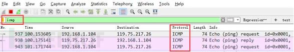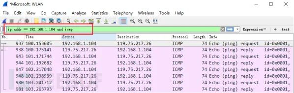 过滤多个条件组合时,使用and/or。比如获取IP地址为192.168.1.104的ICMP数据包表达式为ip.addr == 192.168.1.104 and icmp