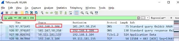 ip.src ==192.168.1.104 显示源地址为192.168.1.104的数据包列表