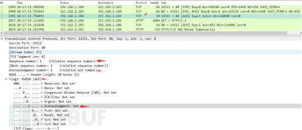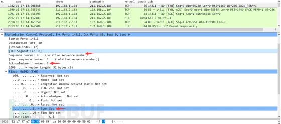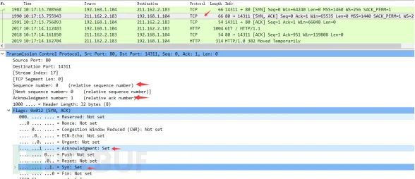 服务器发回确认包, 标志位为 SYN,ACK. 将确认序号(Acknowledgement Number)设置为客户的I S N加1以.即0+1=1, 如下图